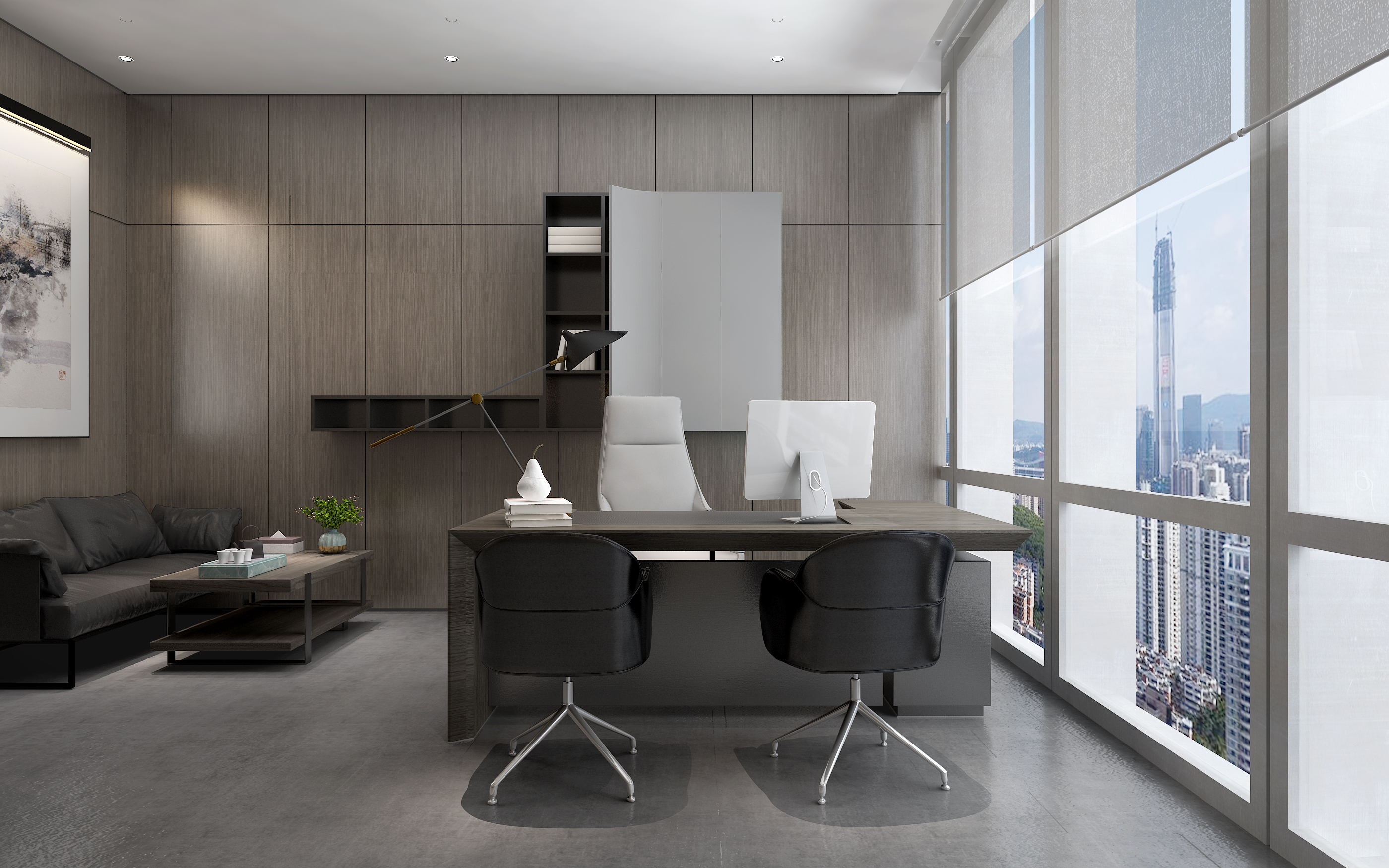 淺灰色和白色的墻壁與深色木質(zhì)地板優(yōu)雅而和諧地結(jié)合在一起,為整個空間增添了一種高雅而專業(yè)的氛圍。設(shè)計師在辦公室的裝飾上注重細節(jié),用綠色植物和現(xiàn)代藝術(shù)品的裝飾點綴,使整個空間更加生機和活力。